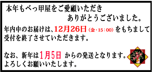 べっ甲屋本店は 平日9:00-19:00/ 日祝9:00-18:00 で営業しております。 1月1日、2日はお休みをいただきます。 イオン姶良店・イオン隼人国分店は、休まず営業しております。 |